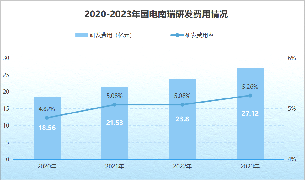 公司較強(qiáng)的技術(shù)實(shí)力離不開(kāi)持續(xù)的研發(fā)投入。2020到2023年,國(guó)電南瑞研發(fā)費(fèi)用率從4.82%提高到5.26%,超過(guò)了平高電氣等公司。