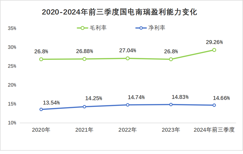 2020到2024年前三季度,國(guó)電南瑞毛利率從26.8%提高到29.26%,凈利率從13.54%提高到14.66%。
