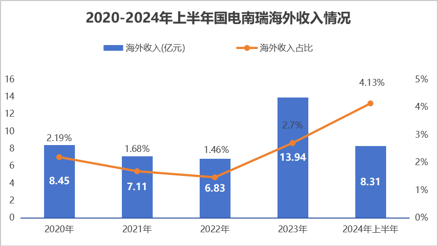 2020到2023年,國(guó)電南瑞海外收入從8.45億穩(wěn)步攀升至13.94億,海外收入占比也從2.19%逐步提高到2.7%,增長(zhǎng)勢(shì)頭強(qiáng)勁。2024年上半年,這一增長(zhǎng)趨勢(shì)得以延續(xù),公司海外收入占比進(jìn)一步躍升至4.13%。