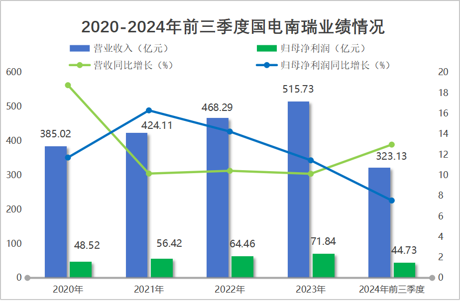 2020到2023年,國(guó)電南瑞營(yíng)收從385.02億增長(zhǎng)到515.73億,年復(fù)合增長(zhǎng)率為10.23%;歸母凈利潤(rùn)從48.52億增長(zhǎng)到71.84億,年復(fù)合增長(zhǎng)率為13.98%,業(yè)績(jī)?cè)鲩L(zhǎng)穩(wěn)健。