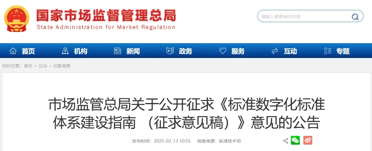 為深入貫徹落實(shí)黨中央、國務(wù)院關(guān)于推動(dòng)標(biāo)準(zhǔn)化工作向數(shù)字化、網(wǎng)絡(luò)化、智能化轉(zhuǎn)型的決策部署,實(shí)施《國家標(biāo)準(zhǔn)化發(fā)展綱要》和《質(zhì)量強(qiáng)國建設(shè)綱要》,充分發(fā)揮標(biāo)準(zhǔn)的基礎(chǔ)性、引領(lǐng)性作用,加快構(gòu)建結(jié)構(gòu)合理、層次分明、適應(yīng)經(jīng)濟(jì)社會(huì)高質(zhì)量發(fā)展的標(biāo)準(zhǔn)數(shù)字化標(biāo)準(zhǔn)體系。市場監(jiān)管總局起草了《標(biāo)準(zhǔn)數(shù)字化標(biāo)準(zhǔn)體系建設(shè)指南 (征求意見稿)》,現(xiàn)向社會(huì)公開征求意見,意見反饋截止日期為2025年3月12日。公眾可以通過以下途徑和方式提出意見: