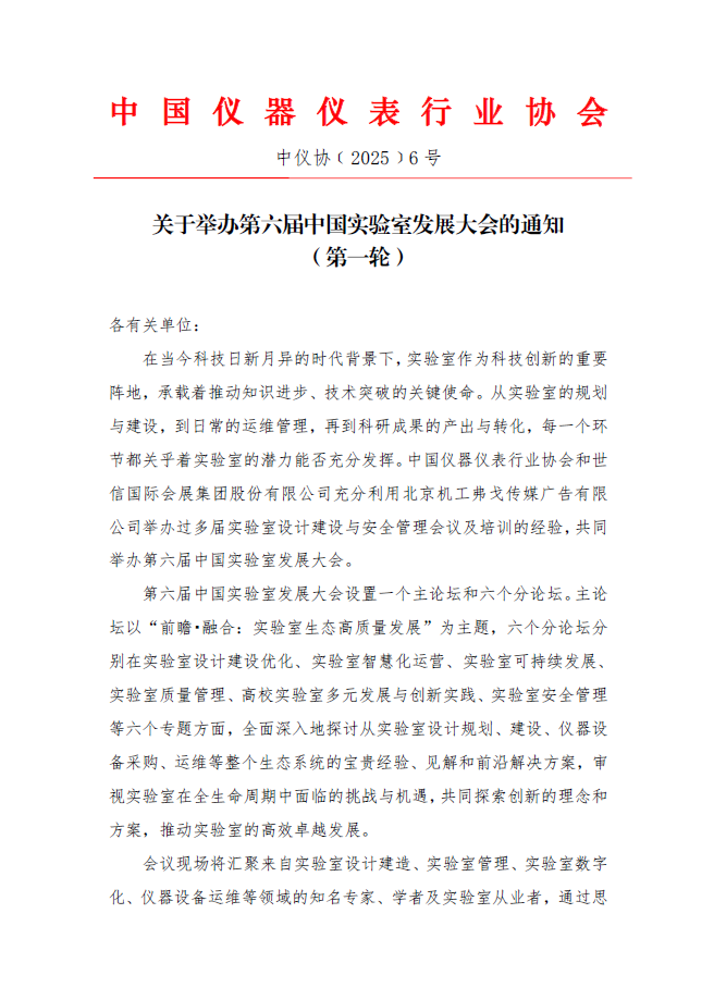 我們誠摯邀請您參加第六屆中國實驗室發(fā)展大會,讓我們攜手共進,以此次會議為新的起點,開啟實驗室全生命周期高質量發(fā)展的新篇章,推動我國實驗室領域不斷邁向更高水平,為科技進步和社會發(fā)展作出更大的貢獻。