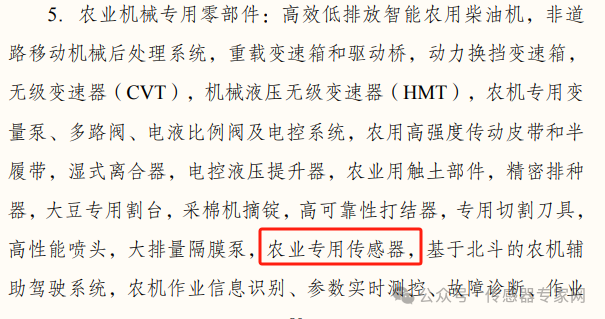 《目錄》儀器儀表領域中,基礎零部件和元器件共計37種,其中傳感器20種,有4種農業傳感器被點名列入,分別是:播種作業資料傳感器、收獲作業資料傳感器、植物信息傳感器、土壤信息傳感器。