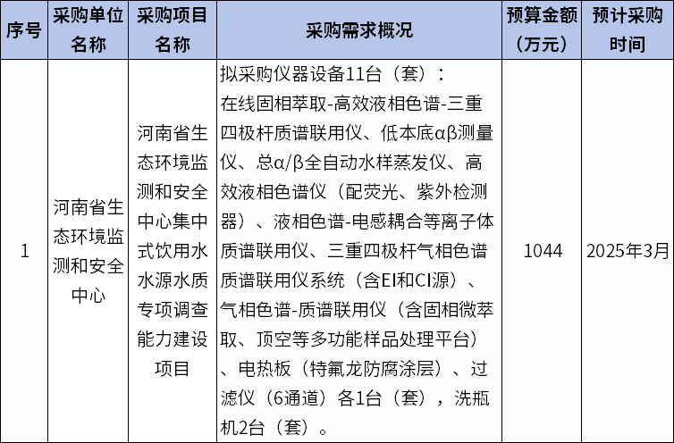 河南省生態(tài)環(huán)境監(jiān)測(cè)和安全中心集中式飲用水水源水質(zhì)專項(xiàng)調(diào)查能力建設(shè)項(xiàng)目采購(gòu)意向公開(kāi),擬采購(gòu)儀器設(shè)備11臺(tái)(套),預(yù)算金額1044萬(wàn)元。