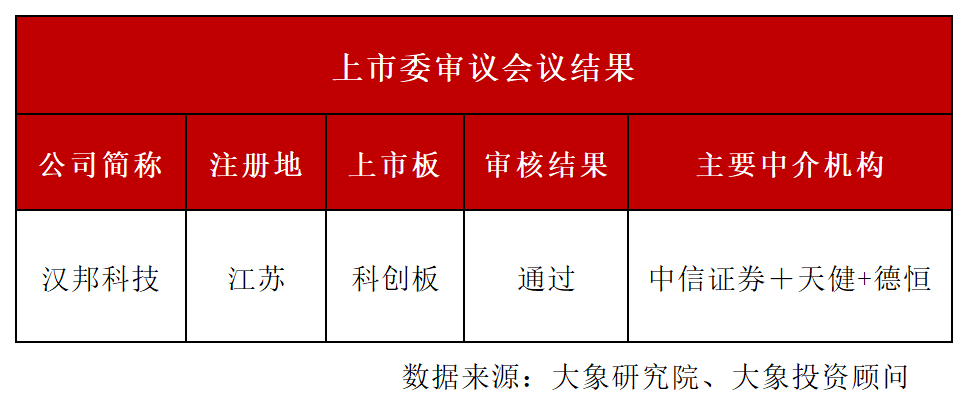 據(jù)了解,上交所上市審核委員會2025年第3次審議會議于2月21日召開,審議江蘇漢邦科技股份有限公司(以下簡稱“漢邦科技”)科創(chuàng)板IPO申請,獲通過。這也是蛇年科創(chuàng)板首家IPO上會企業(yè)。