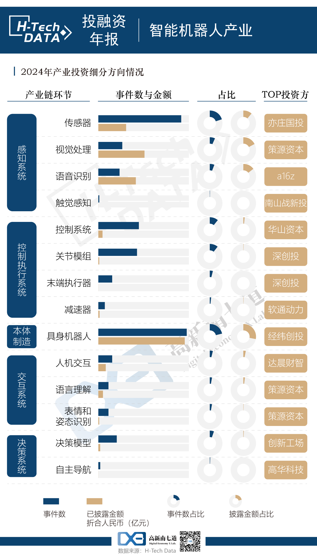 細分來看,機器人本體制造環(huán)節(jié)投資事件數(shù)量和金額最多,而感知系統(tǒng)緊隨其后,其中傳感器在感知系統(tǒng)中投資事件和金額占絕大多數(shù),事件數(shù)量上,感知系統(tǒng)-傳感器、視覺處理、語音識別合計收獲66起融資,占比18.6%。