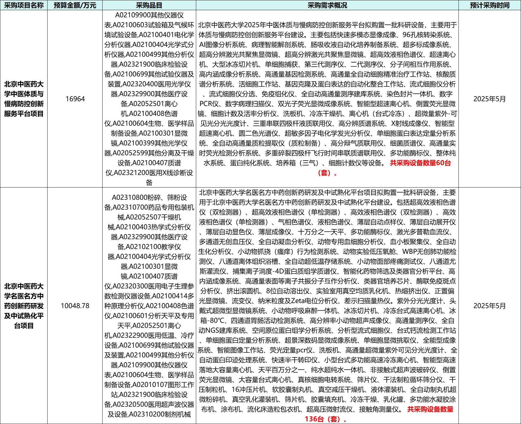 4月25日,北京中醫(yī)藥大學在中國政府采購網連續(xù)發(fā)布兩項采購意向,采購金額總計為27012.78萬元。此前,北京中醫(yī)藥大學名醫(yī)名方中藥創(chuàng)新藥研發(fā)及中試熟化平臺項目計劃采購的10048.78萬元項目,隨后,北京中醫(yī)藥大學再就北京中醫(yī)藥大學中醫(yī)體質與慢病防控創(chuàng)新服務平臺項目發(fā)布16964萬元采購項目,且計劃采購日期為5月份。仔細梳理兩個項目擬采購的儀器設備發(fā)現,本次擬采購的儀器設備除涵蓋色譜、質譜等大型分析類儀器,光學儀器、前處理儀器以及生化分析儀器等也在本次擬采購范圍之內。詳細信息如下: