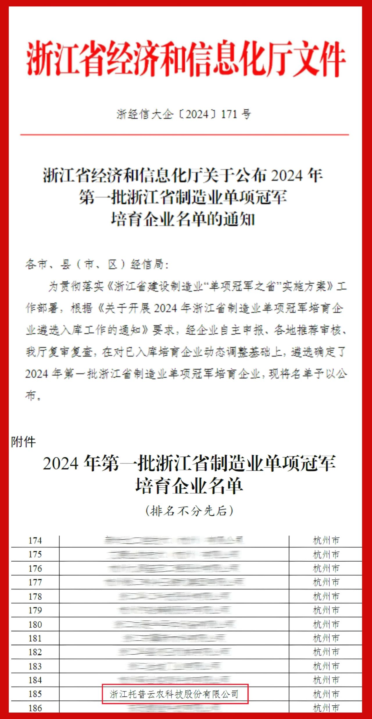 近日,浙江省經(jīng)信廳公布了2024年第一批浙江省制造業(yè)單項冠軍培育企業(yè)名單,根據(jù)《關于開展2024年浙江省制造業(yè)單項冠軍培育企業(yè)遴選入庫工作的通知》要求,經(jīng)企業(yè)自主申報、各地推薦審核、省廳復審復查,浙江托普云農(nóng)科技股份有限公司(以下簡稱“托普云農(nóng)”)成功入選。