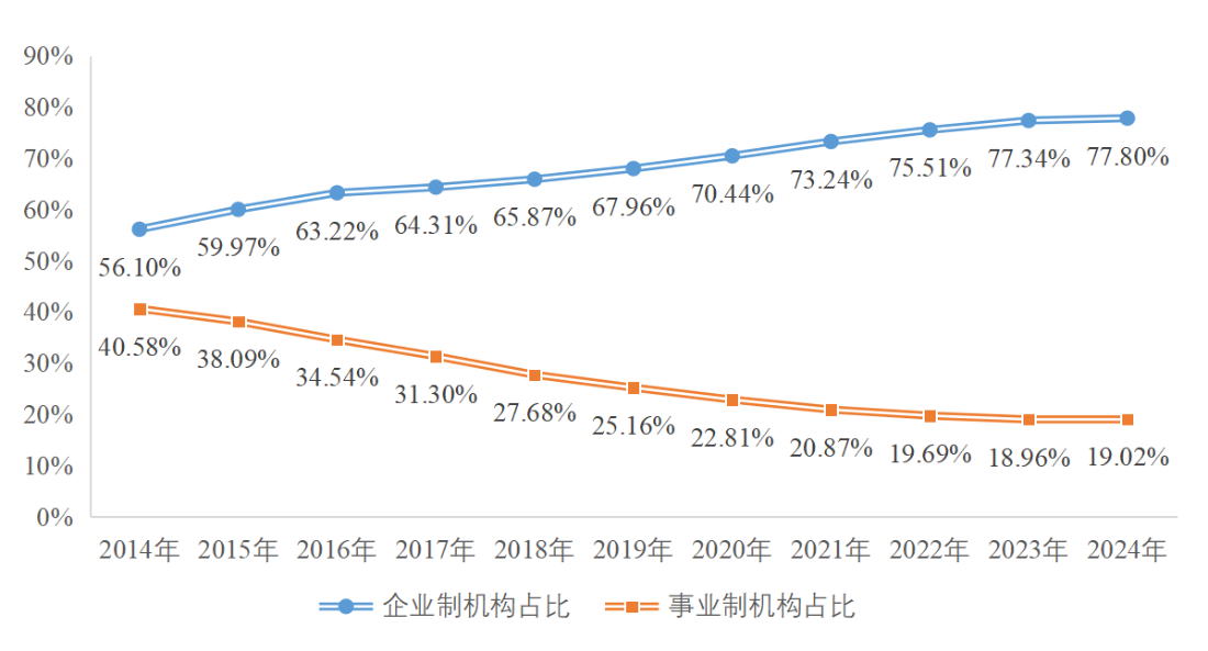 1-1 2014-2024年企業制機構和事業制機構占比情況