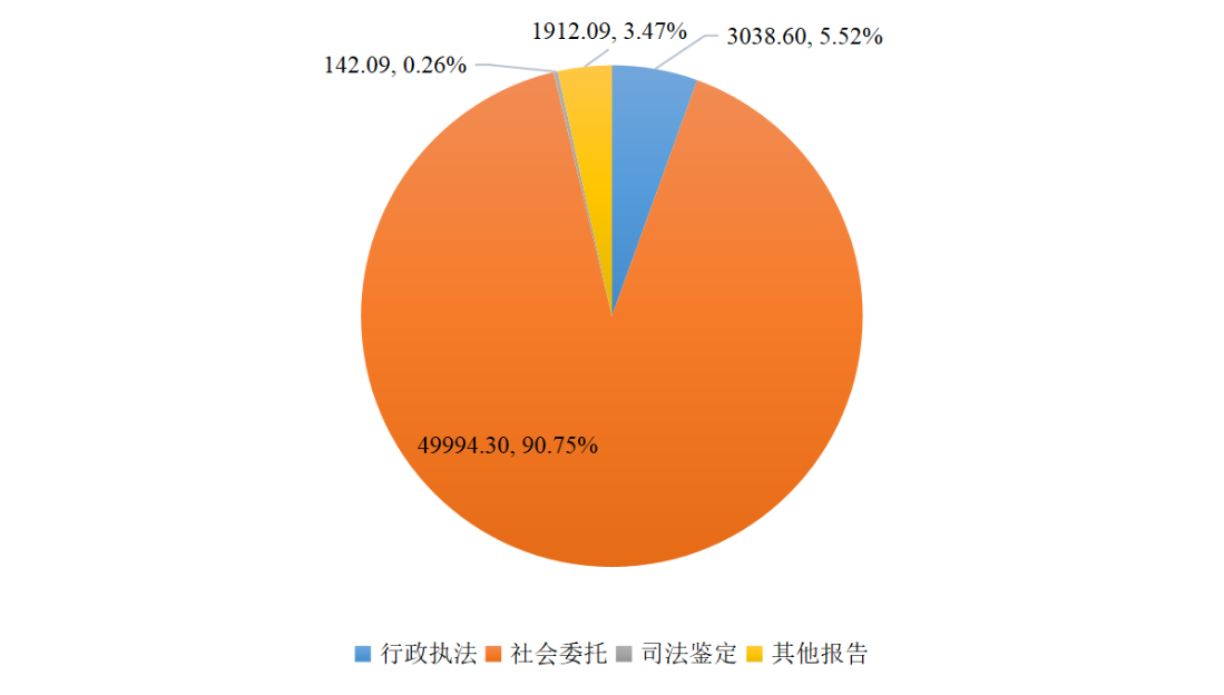 2024年共出具檢驗檢測報告5.51億份,同比下降8.66%,平均每天對社會出具各類報告150.92萬份。其中,出具行政執法類報告3038.60萬份,占比5.52%,同比下降8.25%;出具社會委托類報告49994.30萬份,占比90.75%,同比下降7.06%;出具司法鑒定類報告數142.09萬份,占比0.26%,同比增長0.76%