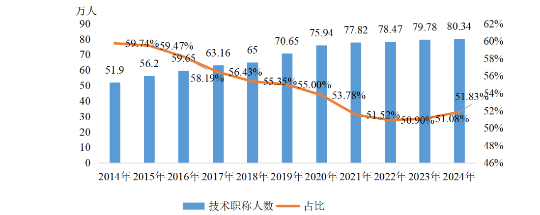1-4 2014-2024年全國檢驗檢測機構擁有技術職稱人員分布情況