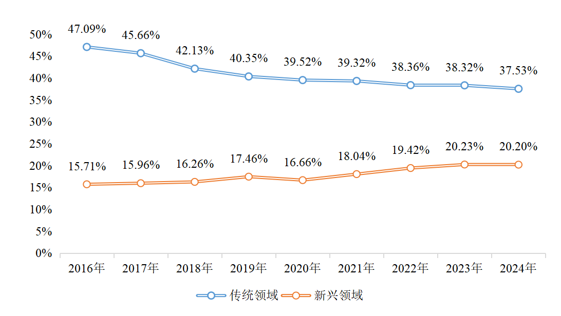 2-2 2016-2024年檢驗檢測傳統和新興領域占行業總收入比重情況