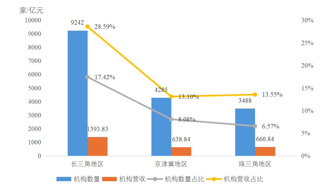 4-2 2024年長三角、京津冀和珠三角地區機構數量、營收及占比情況