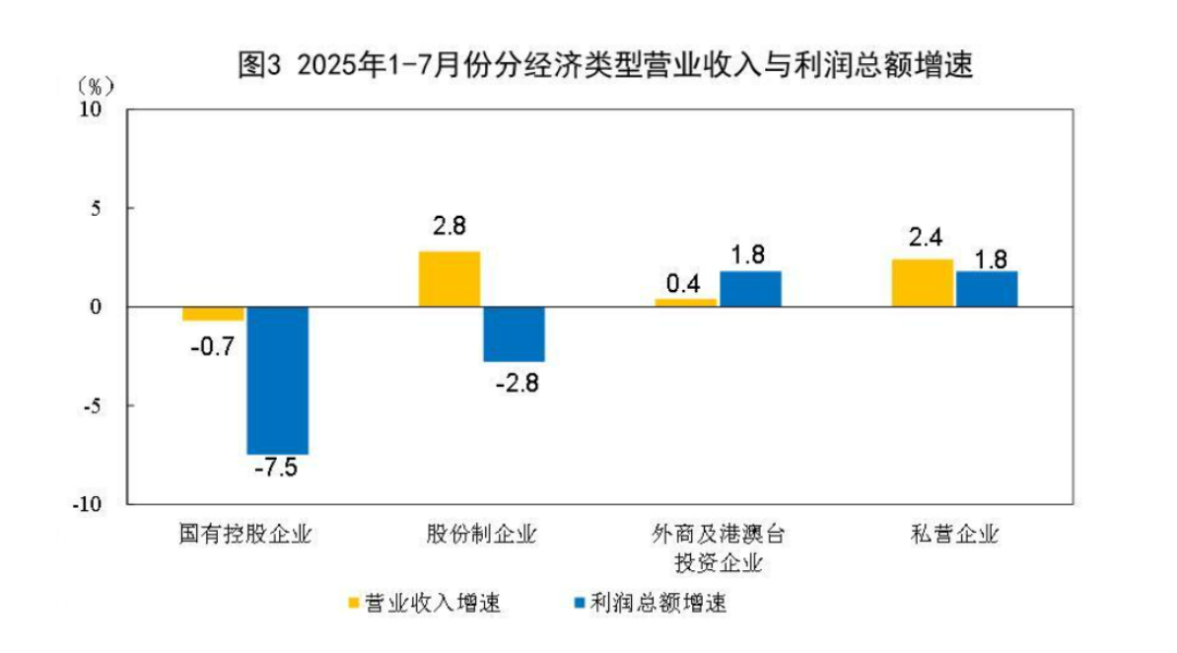 1—7月份,規(guī)模以上工業(yè)企業(yè)中,國有控股企業(yè)實(shí)現(xiàn)利潤總額12823.4億元,同比下降7.5%;股份制企業(yè)實(shí)現(xiàn)利潤總額29742.5億元,下降2.8%;外商及港澳臺(tái)投資企業(yè)實(shí)現(xiàn)利潤總額10216.7億元,增長1.8%;私營企業(yè)實(shí)現(xiàn)利潤總額11183.7億元,增長1.8%。1—7月份,采礦業(yè)實(shí)現(xiàn)利潤總額4930.9億元,同比下降31.6%;制造業(yè)實(shí)現(xiàn)利潤總額30235.8億元,增長4.8%;電力、熱力、燃?xì)饧八a(chǎn)和供應(yīng)業(yè)實(shí)現(xiàn)利潤總額5036.8億元,增長3.9%。