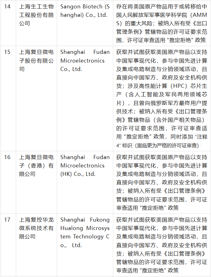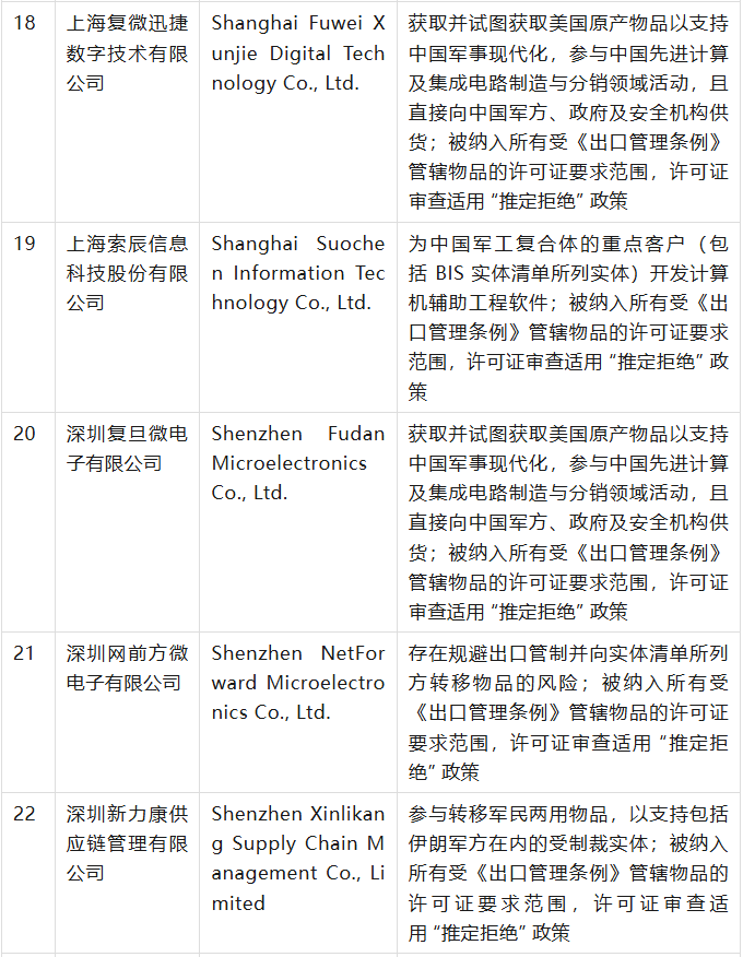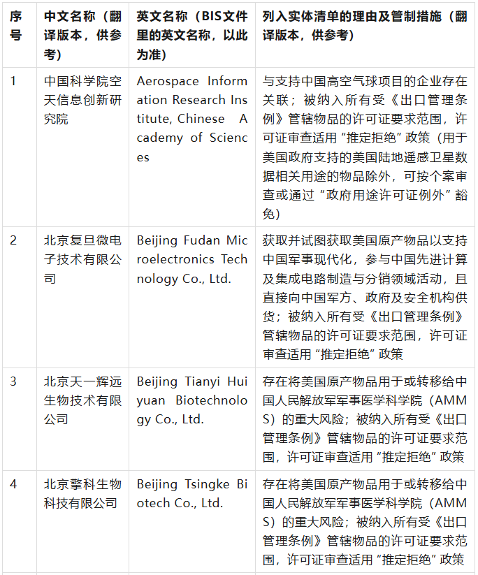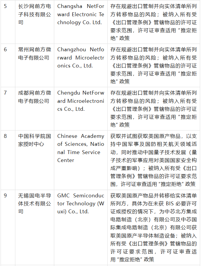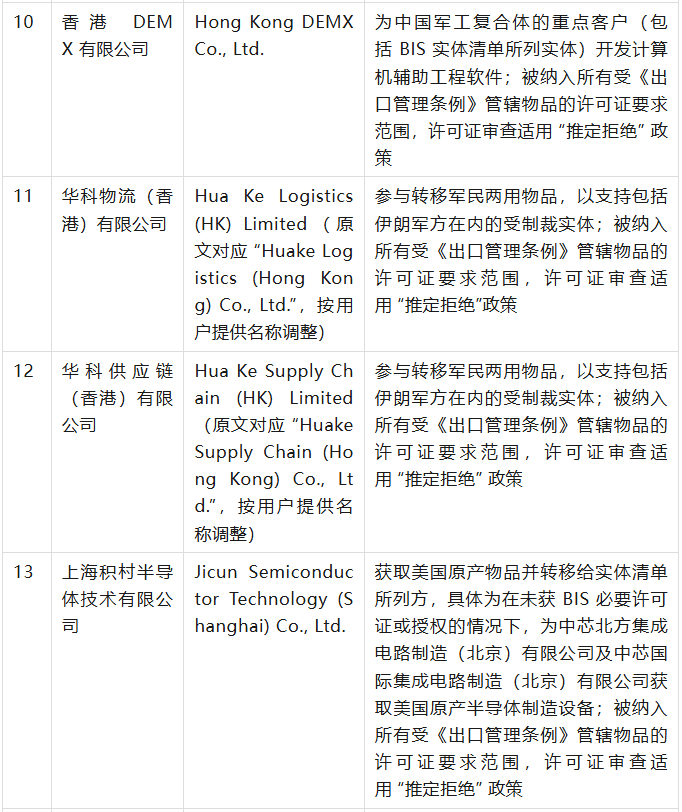 美國(guó)商務(wù)部工業(yè)與安全局(BIS)于9月12日在美國(guó)聯(lián)邦公報(bào)發(fā)布公告,通過(guò)修訂《出口管理?xiàng)l例》(EAR),將 32 家實(shí)體新增至實(shí)體清單,其中有23家是中國(guó)公司,具體清單、列入實(shí)體清單的理由及管制措施如下表(表中提及的列入實(shí)體清單的理由為BIS方面指認(rèn),不代表本號(hào)對(duì)該理由或相關(guān)事實(shí)的認(rèn)可):