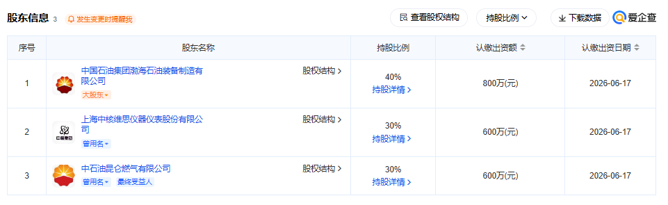 股權(quán)穿透圖顯示,該公司由中國石油天然氣集團有限公司旗下中國石油集團渤海石油裝備制造有限公司、中石油昆侖燃氣有限公司、上海中核維思儀器儀表股份有限公司共同持股。