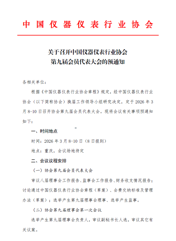 根據《中國儀器儀表行業協會章程》規定,經中國儀器儀表行業協會(以下簡稱協會)換屆工作領導小組研究決定,定于2026 38-10 日召開協會第九屆會員代表大會。現將會議有關事項預通知如下: